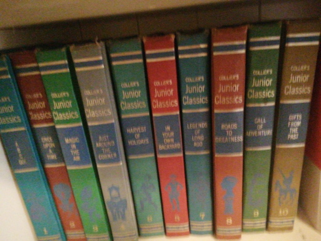 I often see this 10-volume set in restaurants, cafés and pubs where books are used to line shelves, and in second-hand bookshops too, usually for a knock-down price. When we were a young family in the early 1960s, my parents bought the entire 24-volume set of the red-and black-liveried Collier’s Encyclopaedia, with its volumes ‘A to Ameland, Amen to Artillery, Art Nouveau to Beetle’ and so on. This 10-volume set of Junior Classics came with them. Collier’s was an excellent encyclopaedia, and if it reflected an American world-view, it was an even-handed, optimistic and inclusive one, a breath of fresh air. Anything was possible and life was good and everybody was equal. I was gifted the Junior Classics when my parents moved to a smaller house.